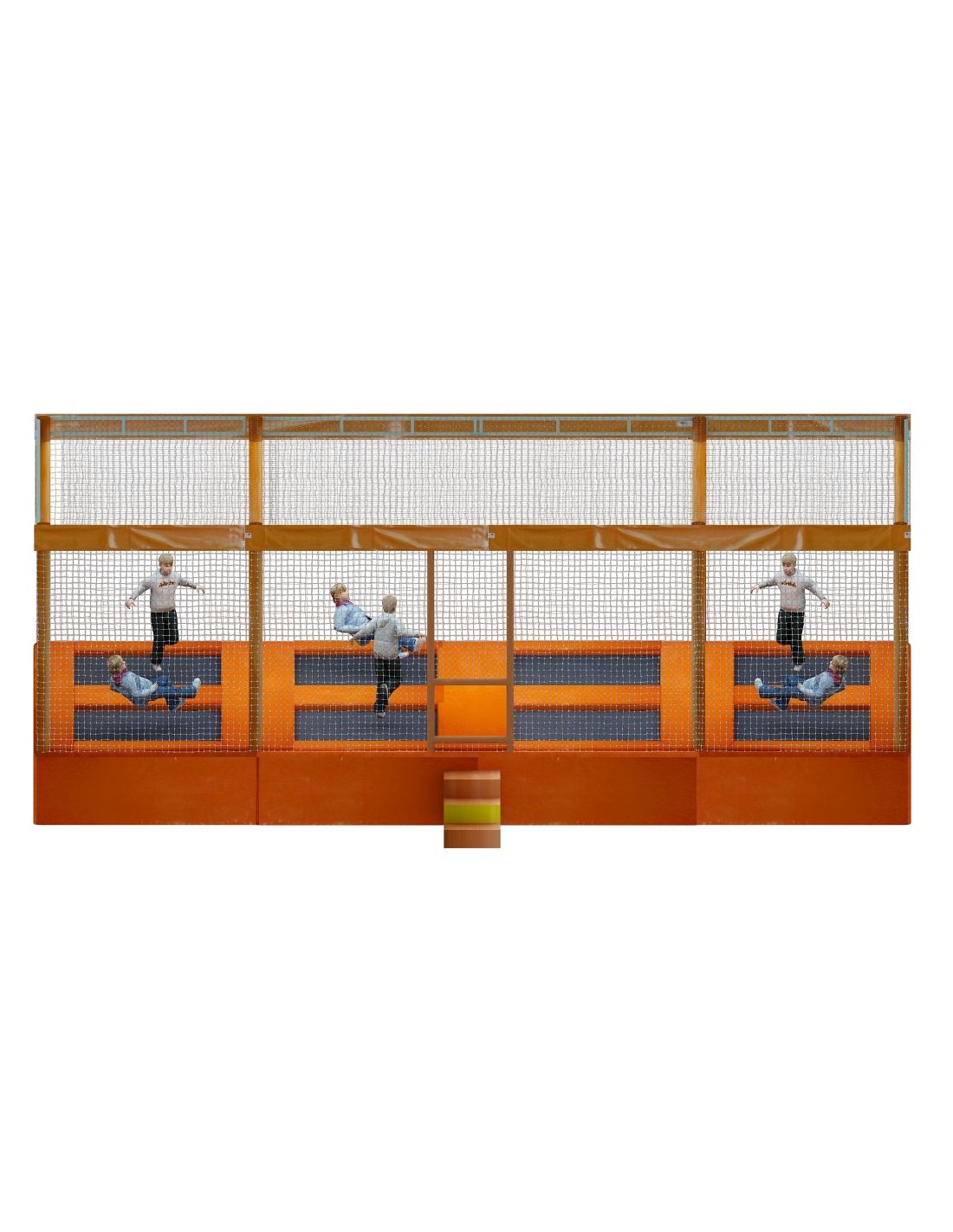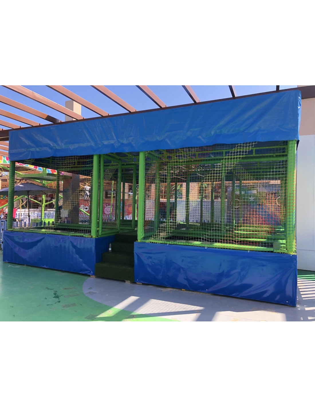 Los pasillos y perímetros están protegidos con colchonetas de foam A/D recubiertas en PVC ignífugo M2, junto con un faldón perimetral y faldilla superior para una máxima protección. Incluye red exterior multicolor, red de techo blanca (3 mm) y pilares recubiertos con coquilla y PVC, garantizando total seguridad en todas las zonas de salto.
