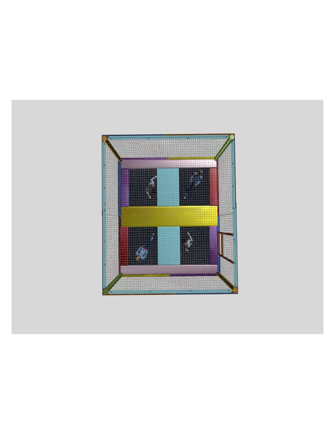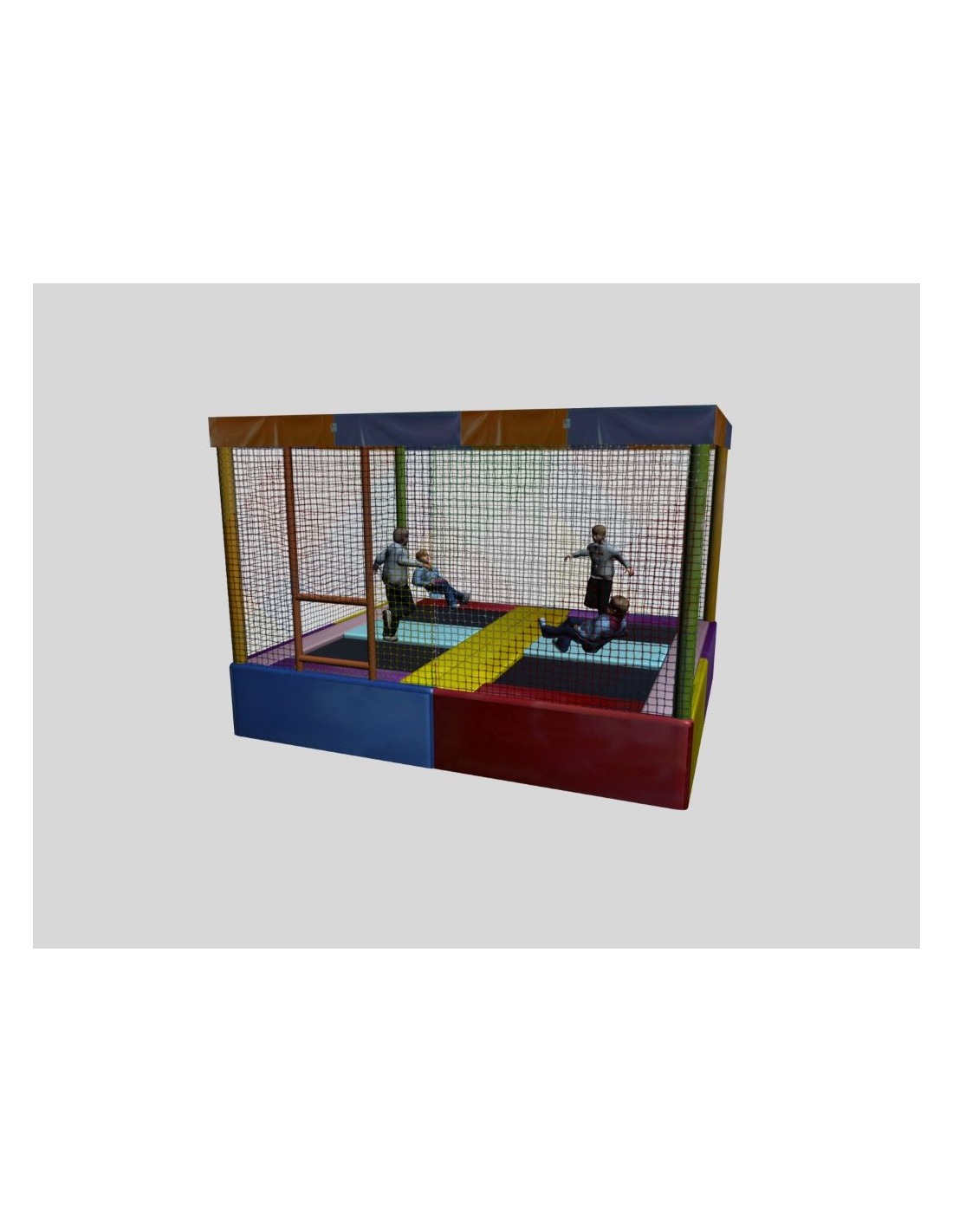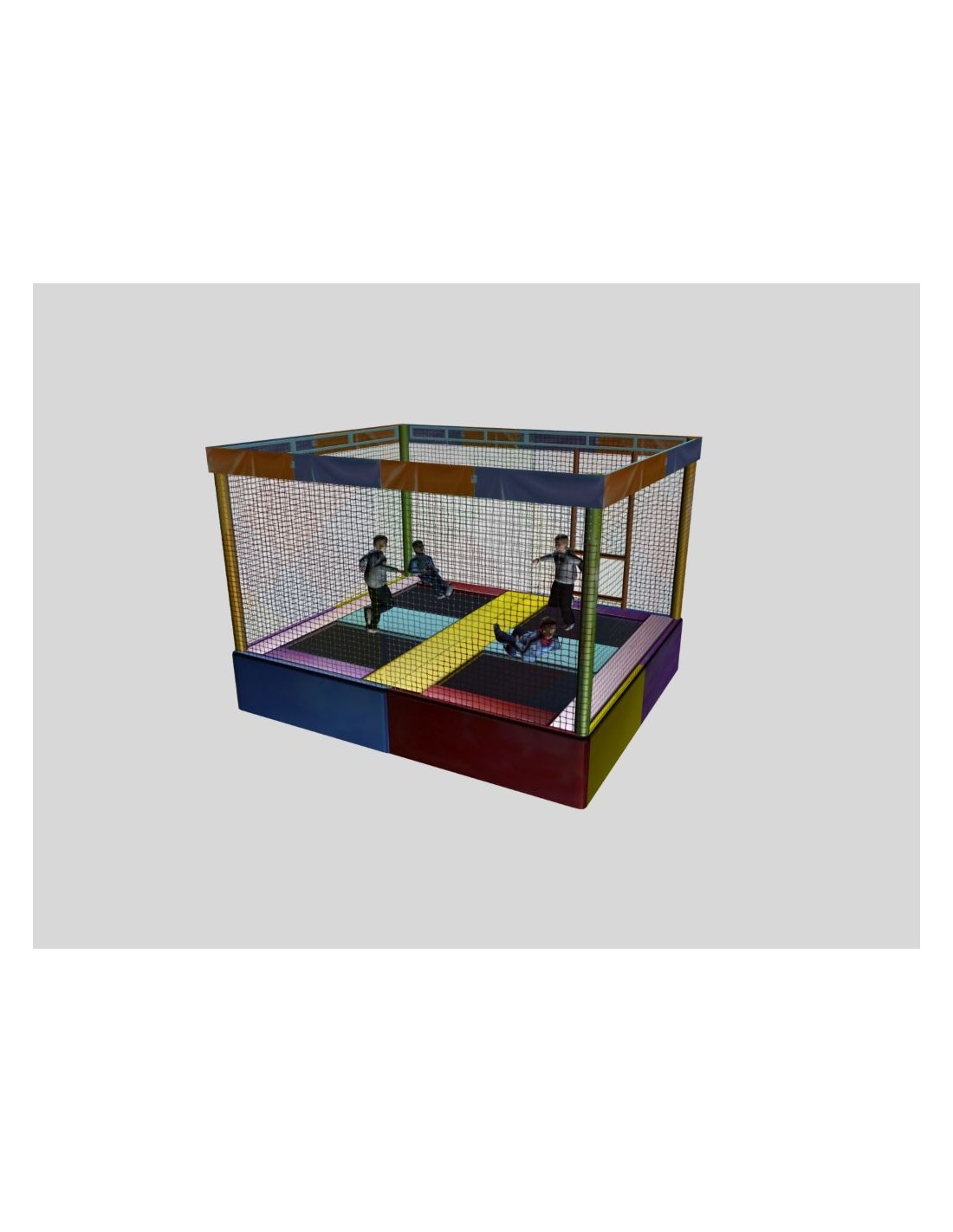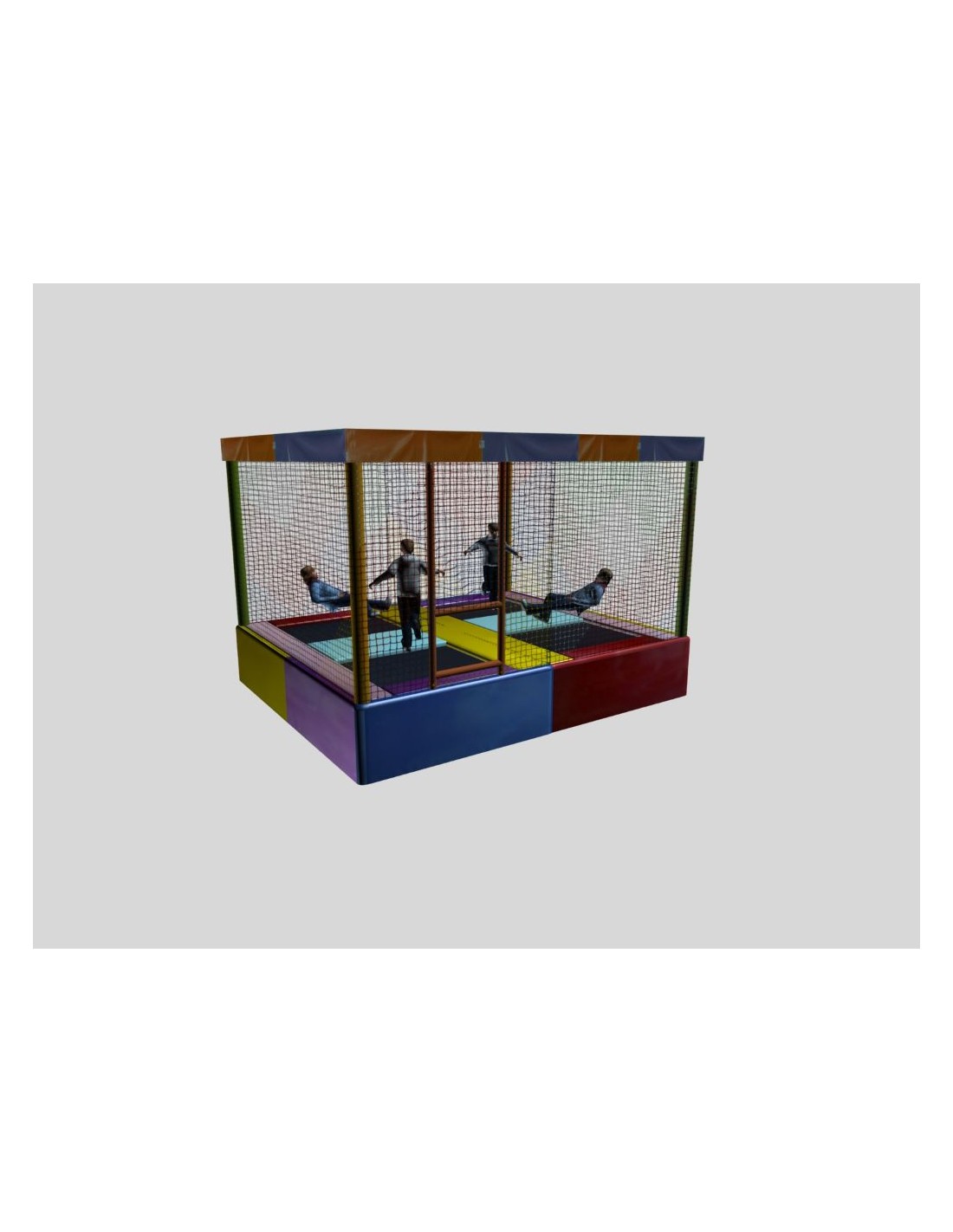 El Bloque de 4 Camas Elásticas Infantiles 4,7x4,7 m es una instalación profesional diseñada especialmente para parques de interior, ofreciendo una zona de salto segura, resistente y visualmente atractiva para niños de entre 2 y 10 años.