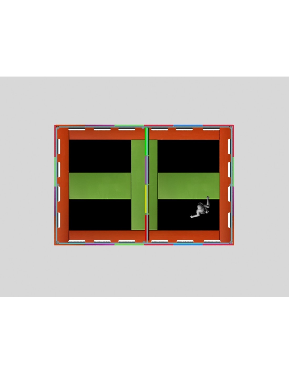 Cuenta con faldón perimetral de PVC ignífugo, redes multicolor laterales (4 mm) y red blanca superior (3 mm), ofreciendo total seguridad en la zona de salto y evitando caídas accidentales.