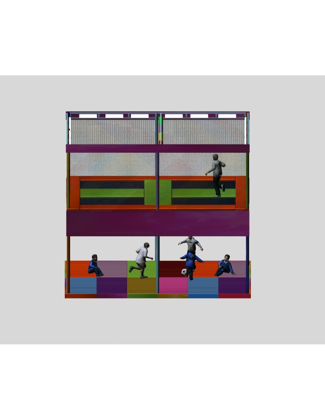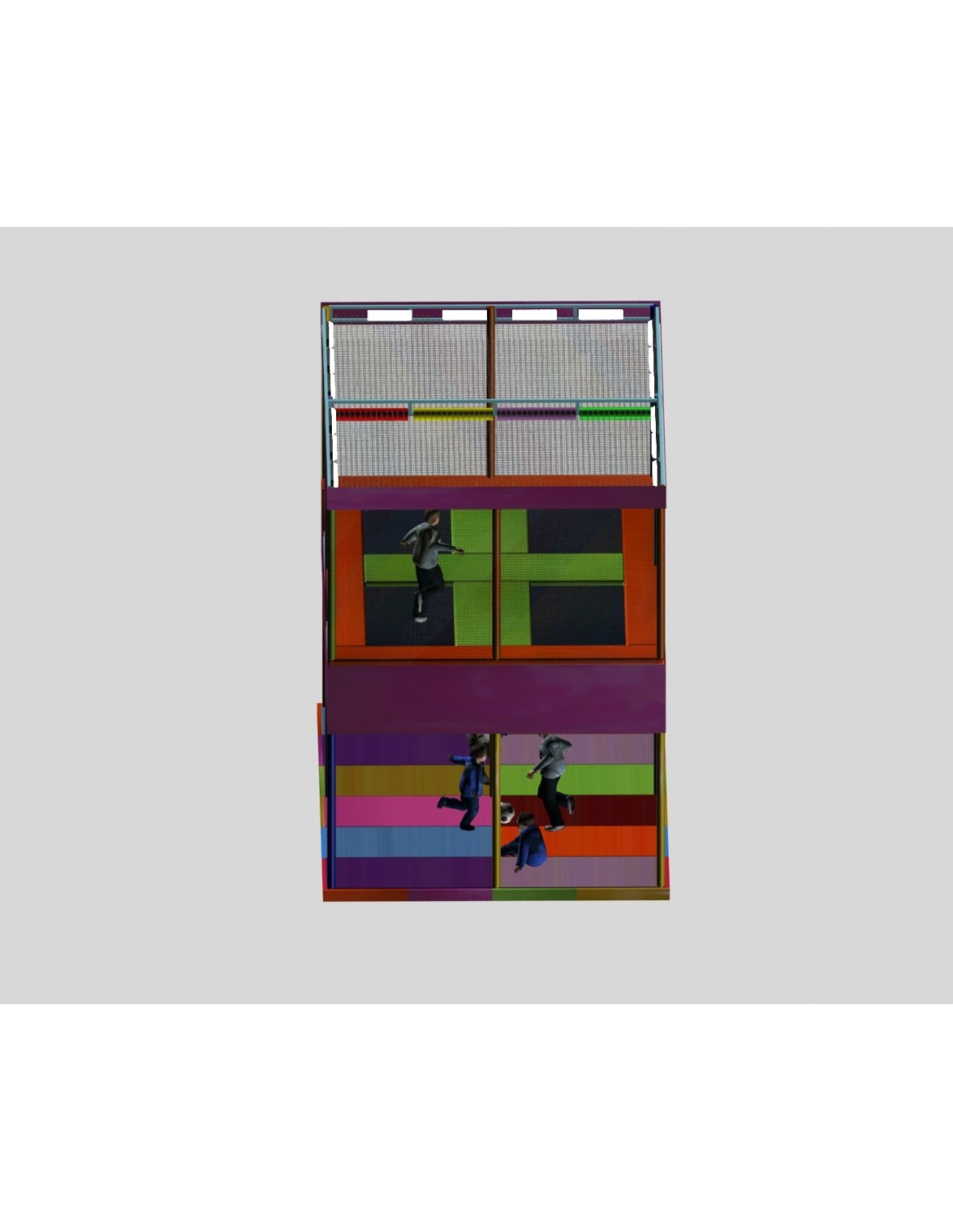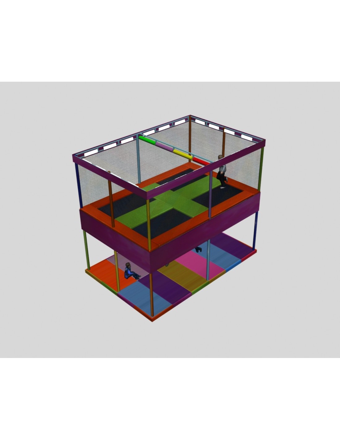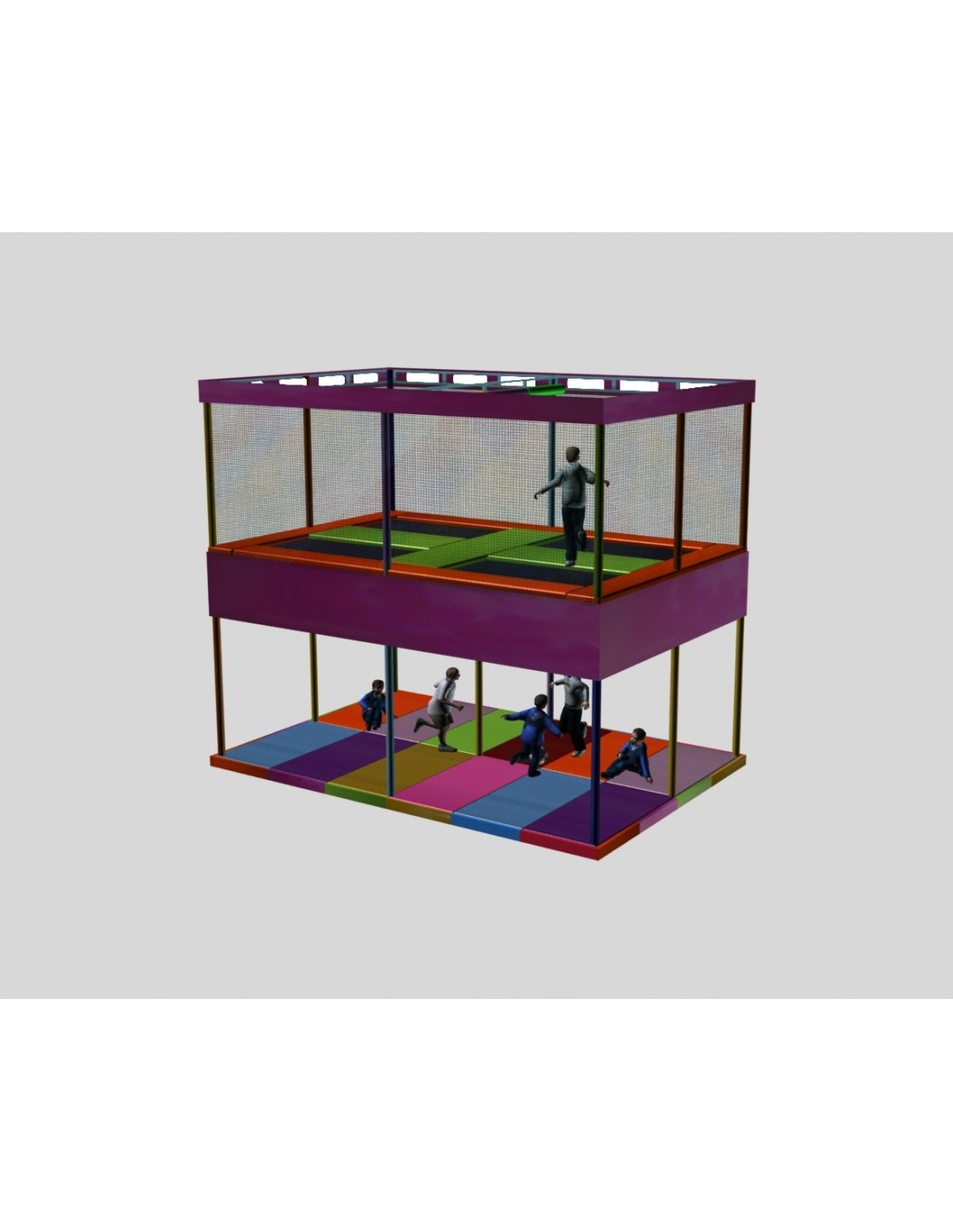 El Bloque de 4 Camas Elásticas Infantiles Elevadas en 2ª Planta es una instalación profesional diseñada para parques infantiles y centros de ocio interior que buscan aprovechar el espacio con una estructura doblemente funcional y segura.
